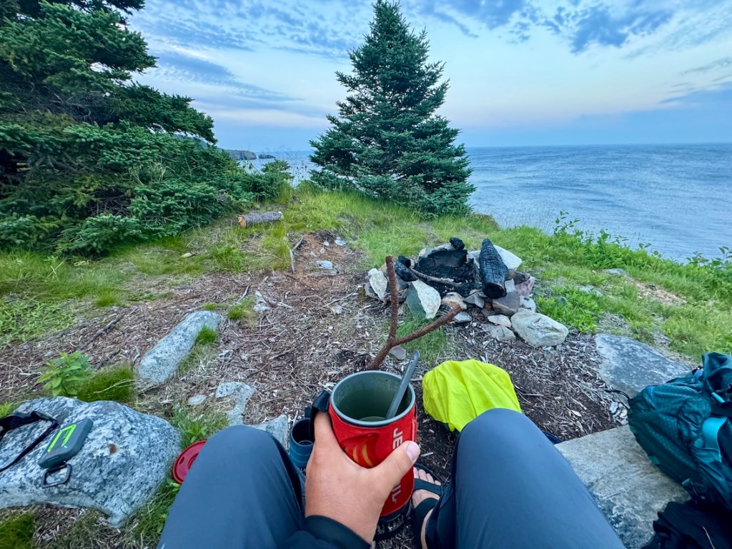 Camping on the East Coast Trail is a mix of official ECTA campsites, a few community campgrounds, and some carefully chosen wild spots, depending on the section you’re hiking. Many paths have designated tent pads or cleared areas near water sources, while others require you to find a tucked-away, low-impact place to spend the night. I used a combination of established sites, sheltered coves, and a couple of exposed headlands with incredible sunrise views. Water is usually available from streams, brooks, or ponds (but it’s essential to filter everything). Some sites can be windy or foggy, so be prepared for coastal weather and always follow Leave No Trace principles when choosing where to camp.