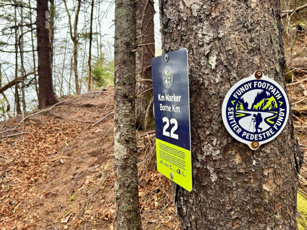 If you’re an experienced hiker, navigating the Fundy Footpath shouldn’t be too difficult. It’s important to be prepared with essential navigation tools such as a compass and map. I downloaded the Fundy Footpath GPS file from AllTrails as well (not perfect but accurate enough for me). The Fundy Footpath is very well marked with white blazes that start outside of Fundy National Park (after Goose River Campground to the south). In the national park, there’s plenty of trail signage to help you on your way.