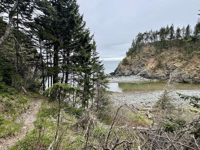 A. Water crossings vary depending on the time of year and amount of rainfall. I didn’t need to remove my boots for the only tidal crossing at Goose Creek because I arrived at the lowest tide. I suggest planning to cross within 3 hours on either side of low tide for Goose Creek. I had to remove my boots for the Little Salmon River crossing. Rivers and creeks can swell in the early season and crossings can be much more difficult.