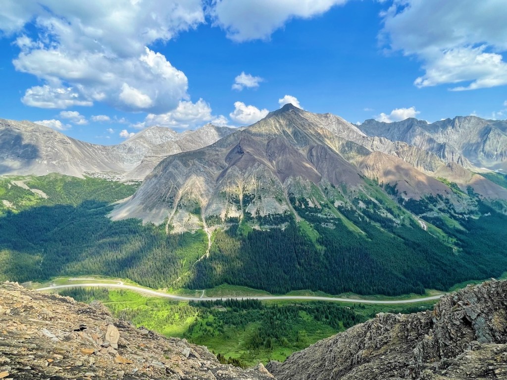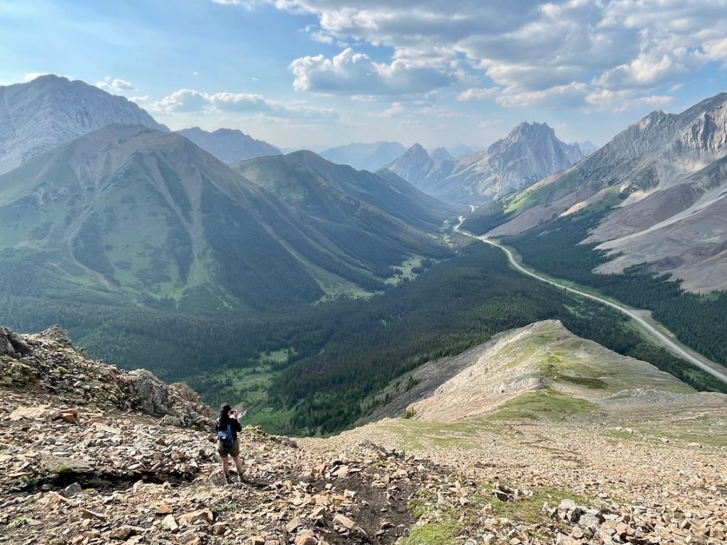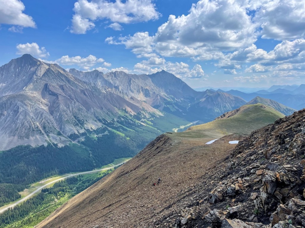 The Highwood Ridge hike starts off on a fairly gentle grade and becomes gradually steeper as you hike through the forest. But don’t worry, it won’t be long before you’re popping out above the treeline and trekking up toward Highwood Peak. Be prepared for loose scree and short scrambles, where you’ll need to use your hands. Make sure to turn around every so often, as the views just get better and better. I couldn’t stop snapping photos as we neared the peak, with Highway 40 on our left and an awe-inspiring mountain range to our right.