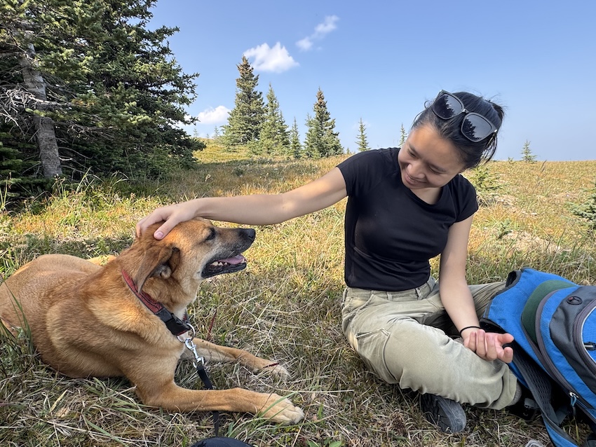 As the three of us climbed higher, the trees gave way to open ridgelines and sweeping views behind us. The final stretch to the fire lookout is steep and exposed, and looks more intimidating than it really is. With the panoramic summit views, it’s easy to see why the Moose Mountain hike is a favourite among Calgarians. It’s a real mountain adventure, just an hour from the city. And yes, it’s also a great trail for adventurous pups, as long as they’re up for the distance and stay leashed (don’t forget their water bowl).