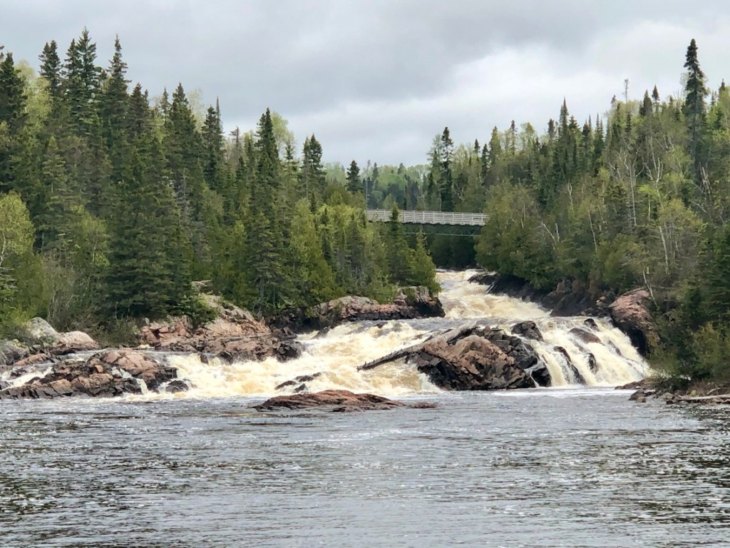 My final day started with a light sprinkle and eventually heavier rain. Hiking on the wet bedrock was particularly tricky, as I carefully walked on the slippery surfaces. Eventually, the trail darts into the rugged forest toward Hook Falls and, soon after, to the impressive Chigamiwinigum Falls. After admiring the rushing waters, I crossed over the White River Suspension Bridge for the final stretch (with lots of boardwalk) to Hattie Cove. Arrived after 5.5 hours.