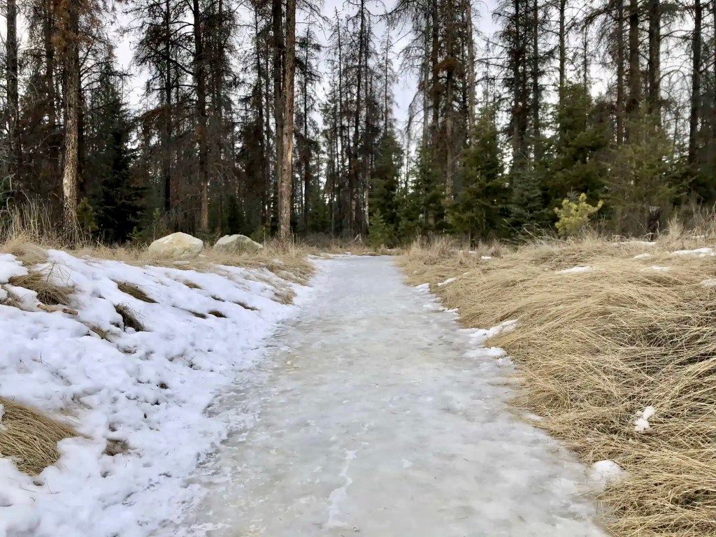 After parking and grabbing my day pack, it was time to start the Valley of the Five Lakes. I didn’t expect to see greenish-blue lakes that draw crowds in the summertime. Even so, I knew it would be a nice walk through the forest (with very few other people). After crossing the Wabasso Creek boardwalk, I pulled my trail crampons out of my pack and put them on my boots. Hiking up the icy trail was much easier with traction. Head up the hill and stay left at the junction to hike clockwise around the loop toward First Lake. You can choose to complete the loop from either direction, though hiking clockwise starts with First Lake and progressively better views on the 6-km journey.