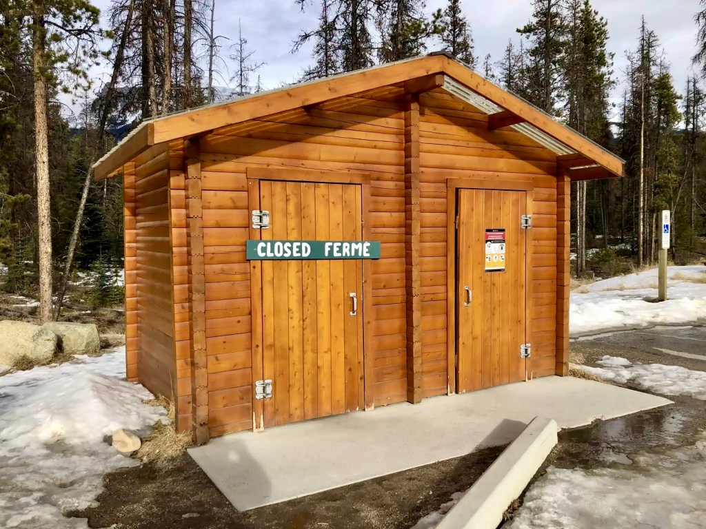 If you’re hanging out in Jasper, Valley of the Five Lakes Trail is very close by. Head south on the Icefields Parkway (Highway 93) for about 10 minutes. Then turn left into the parking area after passing the Valley of the Five Lakes sign on your left-hand side. If you’ve never been (or even if you have), driving from Lake Louise to Jasper on the Icefields Parkway is one of the most scenic road trips in Canada. And in case you’re wondering, there’s an outhouse in the parking area that stays open all year round. So don’t worry — you won’t have to go in the snow!